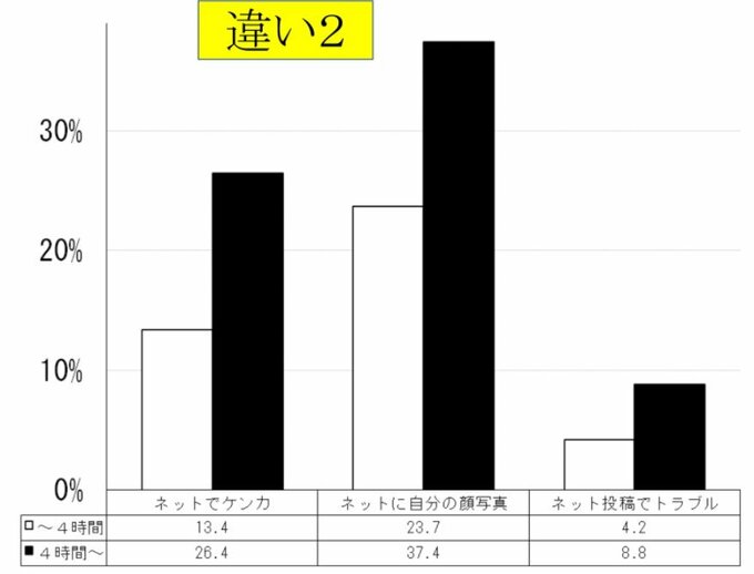それだけではない。「ネットでケンカ」した経験も「4時間以上」の子は「4時間未満」の子の2倍で26.4%。「ネット投稿でトラブル」になった経験も8.8%と2倍多かった。