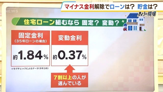 (経済ジャーナリスト荻原博子さん)そうですね。住宅ローンが固定金利で1.84%、変動金利0.37%なんて、もう本当に歴史的ですよ。ただ、これがマイナス金利が解除されたからといって、日銀は金融緩和はやめないわけ、すぐにドーンと跳ね上がるかっていうと、そうではないです。固定の長期はすぐ上がるんだと思うんですけど、変動の方は、『どうしよう、どうしよう』って言ってる時間が結構あるのかなっていう感じはします。