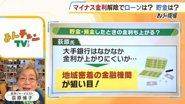 (経済ジャーナリスト荻原博子さん)これまでほとんど金利がつかなかったですからね。でもこの先どんどん上がっていくのかっていうと、解除と言っても、ものすごく慎重に日銀もそろりそろりとやっているので、金融機関の方も、すぐ上げていくわけにはいかないと思います。