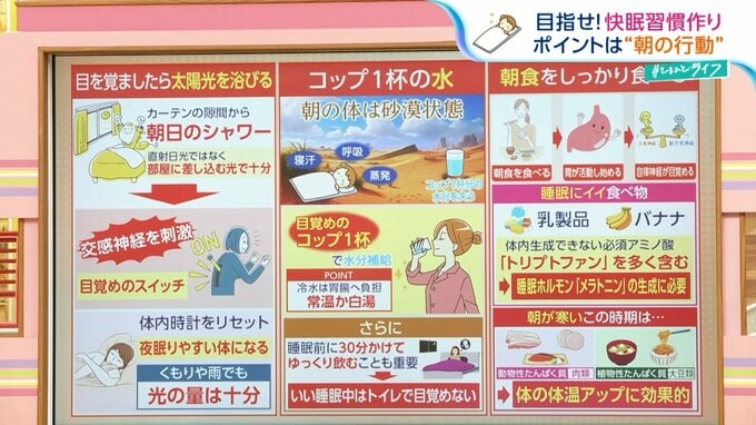 目に光が入ることによって交感神経が刺激され、目覚めのスイッチが入ります。分泌されたセロトニンが夜になってメラトニンにかわり、眠気を催してくれるのです。