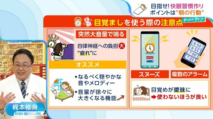 爆音の目覚まし時計は確かに起きますけども、「驚かされて起きる」起き方なわけです。言ってみれば動物だと殺される寸前の起き方をしているわけですから、自律神経に負荷がかかってドキドキした状態になって、朝一番から非常に疲れることになります。