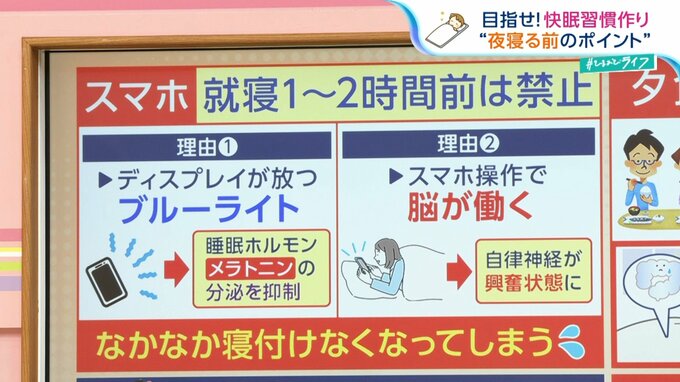 ブルーライトがメラトニンの分泌を抑制してしまいますし、1番よくないのはスマホを能動的に動かすことが多く、興味関心が尽きないのでエンドレスで、どんどん脳が活性化して覚醒度が上がってしまう。それによって眠気が来ないことがやはり一番大きな問題になる。スマホを置く習慣だけはしっかりしてほしい。