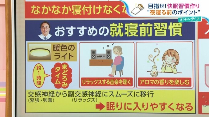 また、就寝の1時間程前から暖色系のできれば間接照明の部屋でゆっくりすると眠りに入りやすくなります。