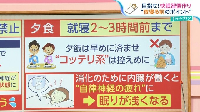 夕飯は早めに済ませ、脂肪系・脂質系は控えめに。