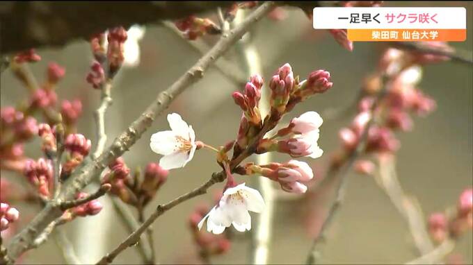 宮城県柴田町にある仙台大学で、一足早くサクラが開花しました。仙台大学の構内のサクラは樹齢50年を超え、根元の直径が60センチ、高さが10メートルほどある「エドヒガン」の雑種です。大学職員が21日、1輪咲いて…