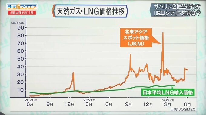権益を持っているからこそ長期的に安い価格で安定的に輸入契約ができる。これが止まればスポットで買わなければならなくなる。北東アジアのLNGのスポット価格を見ると40~50ドルで、高いときには80ドルを超えている。日本の平均LNG輸入価格は長期契約なので、10~20ドルだ。サハリン2からはどれぐらいで買っているのか。