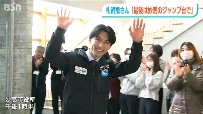 妙高市役所を訪れ、拍手で出迎えられたのは、今シーズンで現役を引退する清水礼留飛さんです。職員から花束を手渡され、熱い抱擁をかわします。22日は父・久之さんと城戸陽二市長のもとを訪れ、現役引退を報告しました。