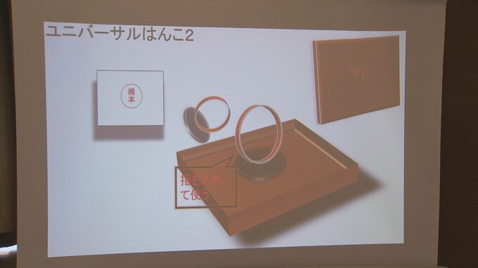 「おばあちゃんがはんこを使っているときに使いにくそうにしてたから、持つときにすべったりするのが困っているのかなと思って、すべりにくいはんこ、力がいらないはんこがあればいいと思い、この作品を思いつきました」