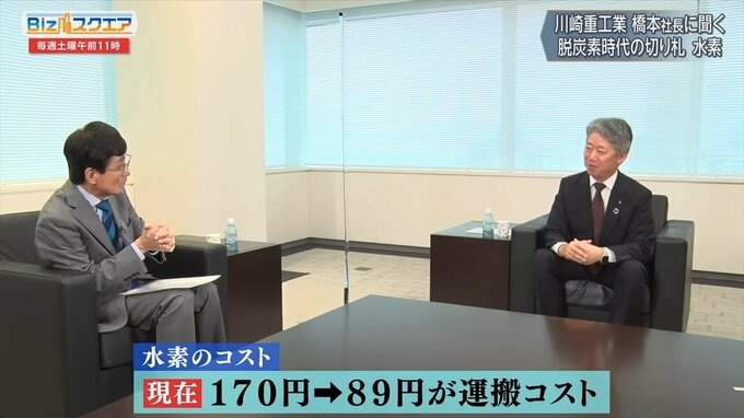 水素は1N㎥(ノルマル立方メートル)あたり170円ぐらいコストがかかっています。そのうちの89円が運搬コストなのです。この運搬コストが商用化実証の大きな船になると、最終的には2円台まで下がるので、エネルギーコストの中に占める運搬コストは極めて小さくなります。