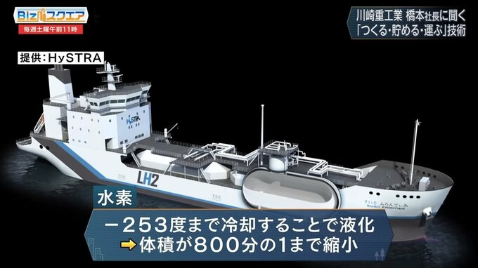 川崎重工では2030年の商用化に向け、タンクの大きさが現在の約128倍で16万㎥、約1万トンの水素を運ぶことができる大型の液化水素運搬船の開発を進めている。一度に大量の水素を運ぶことができれば、その分、価格を抑えられるという。また動力に水素を使うことで、運航中も二酸化炭素を出さないクリーンな水素の輸送が可能になる。