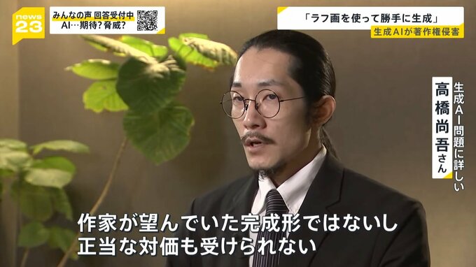 海外の生成AIの訴訟に詳しい高橋尚吾さんは、これまでイラストレーターら300人以上から被害相談を受けてきました。中には下書きをAIで勝手に完成させられたという被害も…。
