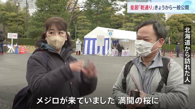 皇居・乾通りできょう、春の一般公開が始まりました。きょうはあいにくの雨。それでも一般公開の初日とあって、およそ5500人が訪れました。上村彩子キャスター「桜はまだまだ咲いていないんですが、一部、少しだけ…