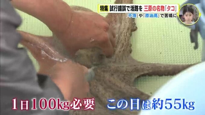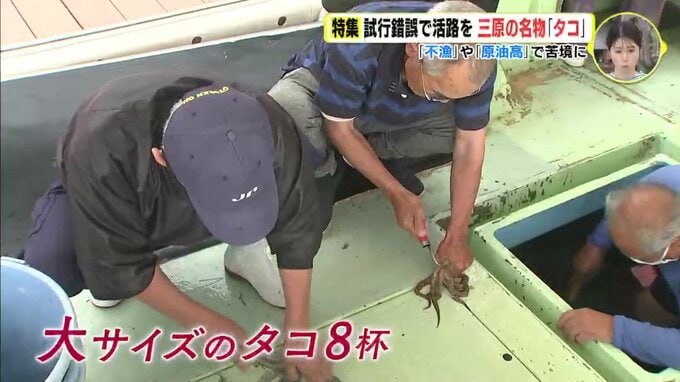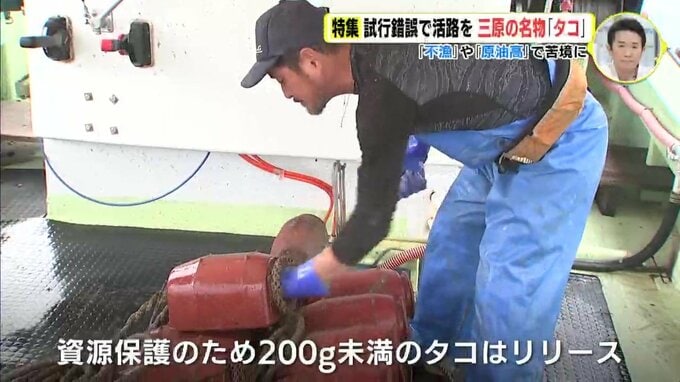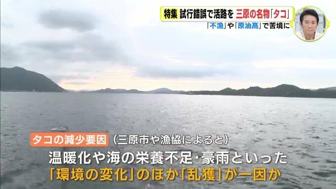 資源保護のため、200グラム未満のタコは、逃がしています。減少した詳しい要因はわかっていませんが、三原市や漁協によりますと、温暖化や海の栄養不足、豪雨といった「環境の変化」のほか、「乱獲」などが一因とされています。