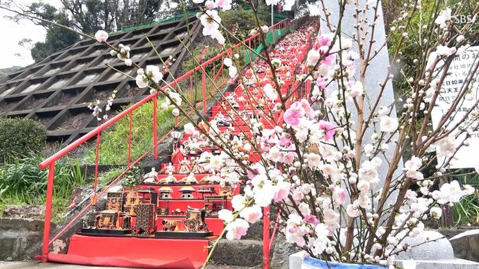 下田市蓮台寺で3月24日、毎年恒例の「しだれ桃の里まつり」が始まり、神社の石段には、日本一の段数となる118段のひな飾りが登場しました。約450本のしだれ桃が植えられている下田市の蓮台寺地区。「しだれ桃の里…