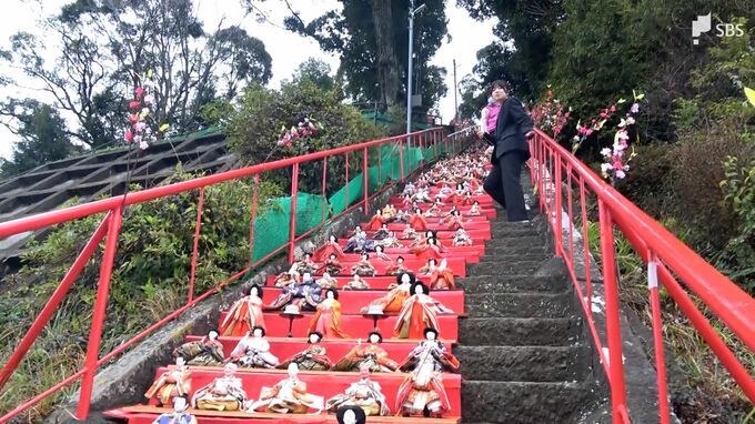 下田市蓮台寺で3月24日、毎年恒例の「しだれ桃の里まつり」が始まり、神社の石段には、日本一の段数となる118段のひな飾りが登場しました。