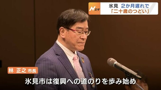 地震で犠牲になった人への黙とうからはじまった式では、氷見市の林正之市長が「氷見市は復興への道のりを歩み始め、本日の二十歳のつどいを開催することができました。前途に広がる無限の可能性を信じて、これからの人生を力強く生きてください」と出席したおよそ350人に言葉を贈りました。