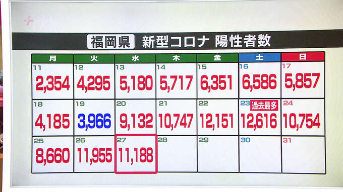 福岡県は27日、新型コロナウイルスの検査で新たに1万1188人が陽性だったと発表しました。先週の同じ曜日より2000人以上増えています。発表自治体別の内訳は、福岡市が5258人、北九州市が174…