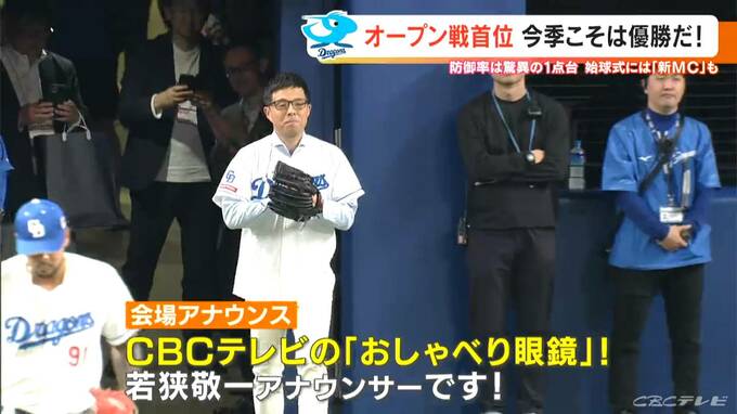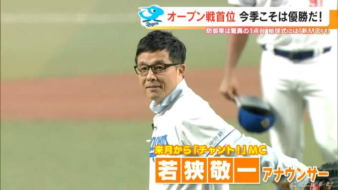 4月から「チャント!」のMCを務める“おしゃべり眼鏡”こと若狭敬一アナウンサー。立浪監督も見守る中、注目のピッチングは。