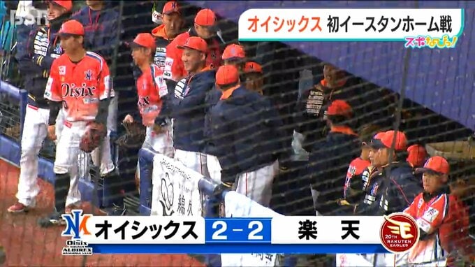 この回、同点に追いつき延長戦へ。延長でも勝敗はつかず、引き分けとなりましたが、球団史に残るホーム開幕戦となりました。