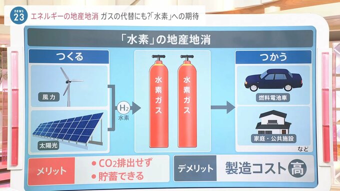 「この節ガスが世界的な問題となる中、代わりとなるエネルギーをどう生み出していくのか、実は今、環境省が力を入れているのが、次世代エネルギーとして期待されています。『水素』の地産地消に向けた取り組みです。どういったものか詳しく見ていきます。まず、風力や太陽光など再生可能エネルギーで作った電力を使って水素を生み出します。その水素を燃料電池車や家庭用の燃料として活用するものでして、ガスの代替エネルギーとしても期待が寄せられているということですね。この水素を活用するメリットですが、生成時に▼CO2を排出しない、そして電気と違ってガスのように、▼貯めておくことができることが大きなメリットかと思います。一方、デメリットは既存の化石燃料と比べると▼コストが高い点ということです。これまでに全国10ヶ所で実証実験が行われていて、今後広がりを見せていきそうです」