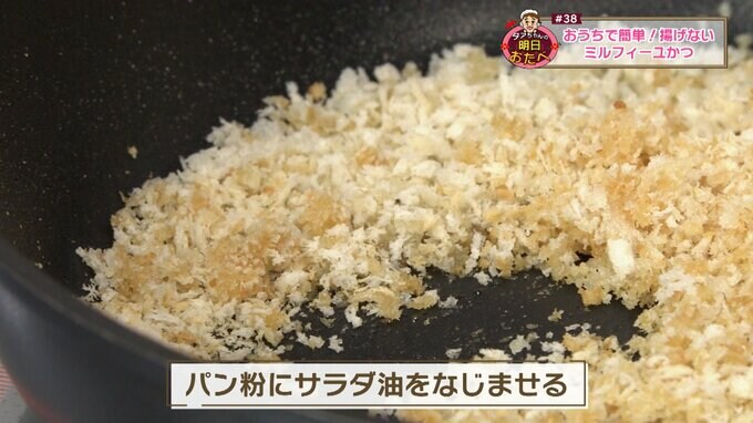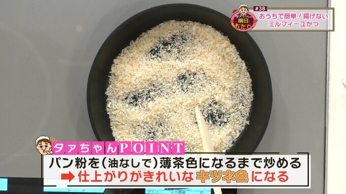 【タァちゃんポイント】パン粉を(油なしで)薄茶色になるまで炒めることで(中火)、仕上がりがきれいなキツネ色になる