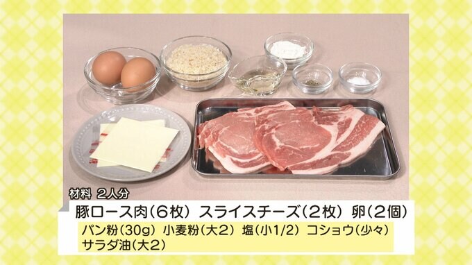 豚ロース肉(6枚)/スライスチーズ(2枚)/卵(2個)/パン粉(30g)/小麦粉(大2)/塩(小1/2)/コショウ(少々)/サラダ油(大2)