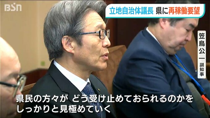 早期再稼働を望む地元議会に対し、笠鳥副知事は「技術委員会の安全確認や避難の実効性の議論なども踏まえて判断する」とこれまでの県のスタンスについて述べました。