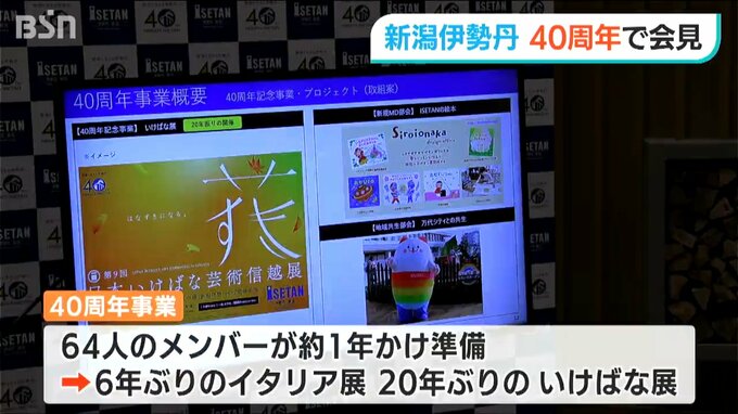 40周年記念事業では64人のプロジェクトメンバーが、およそ1年間かけて準備を進めてきたということで、6年ぶりのイタリア展や20年ぶりのいけばな展が開催される予定です。