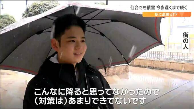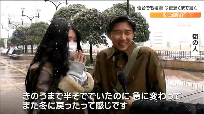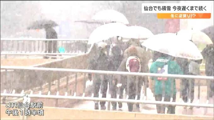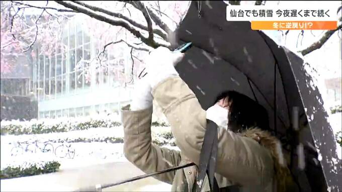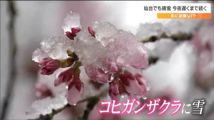 もうすぐサクラも咲こうというのに冬に逆戻りしてびっくりした人も多いのではないでしょうか。26日の宮城県内は低気圧の影響で雨が次第に雪へと変わり、仙台市内では早咲きのサクラに雪が積もりました。雪は26日夜遅くにかけて降り続く所が多く、積雪によるスリップに注意が必要です。