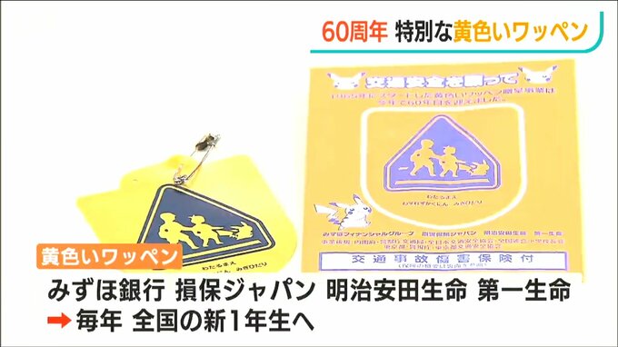 この黄色いワッペンは、銀行や保険会社あわせて4社が毎年、全国の新1年生に贈っているものです。