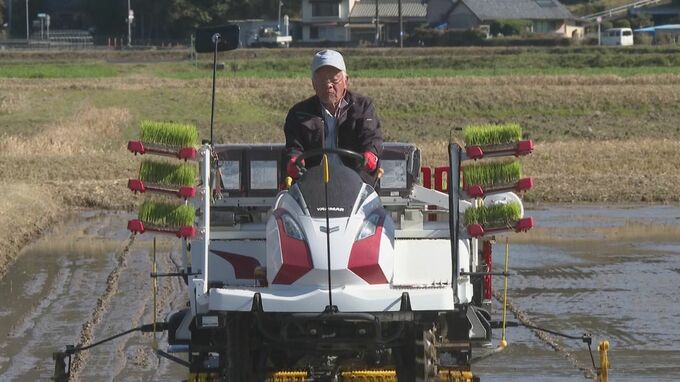中西和益さんの水田でも田植え機を使って、15センチほどに育てた「あきたこまち」の苗が次々と植えられました。