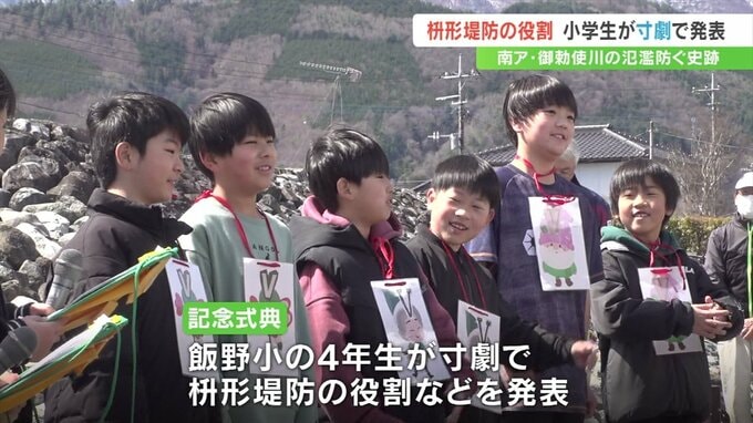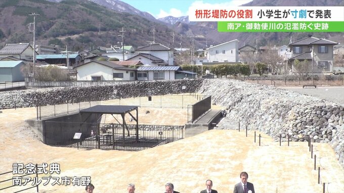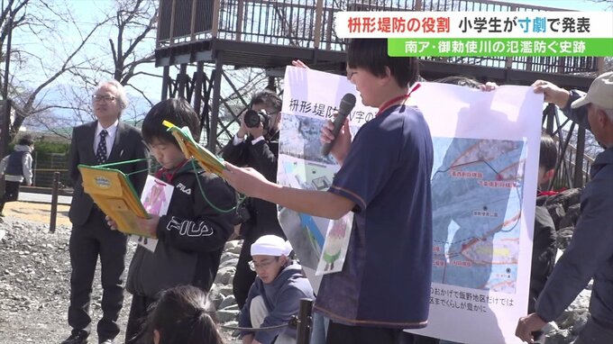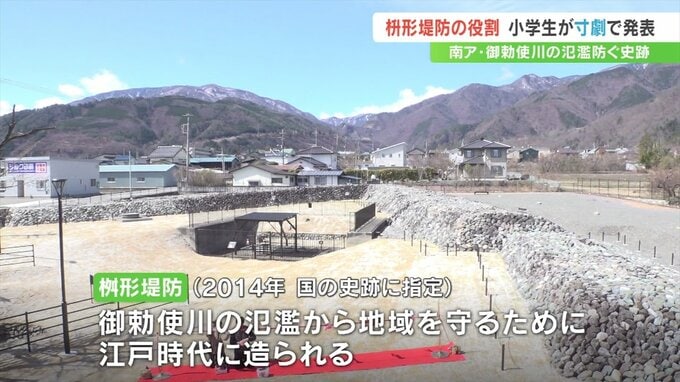 山梨県南アルプス市の御勅使川の氾濫を防ぐ桝形堤防の一般公開を前に、地元の小学生が寸劇で堤防の歴史や役割を発表しました。