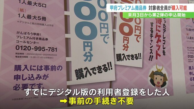 甲府市民対象のプレミアム商品券は一口5000円で、デジタル版は7000円分、紙版は6500円分の買い物ができます。