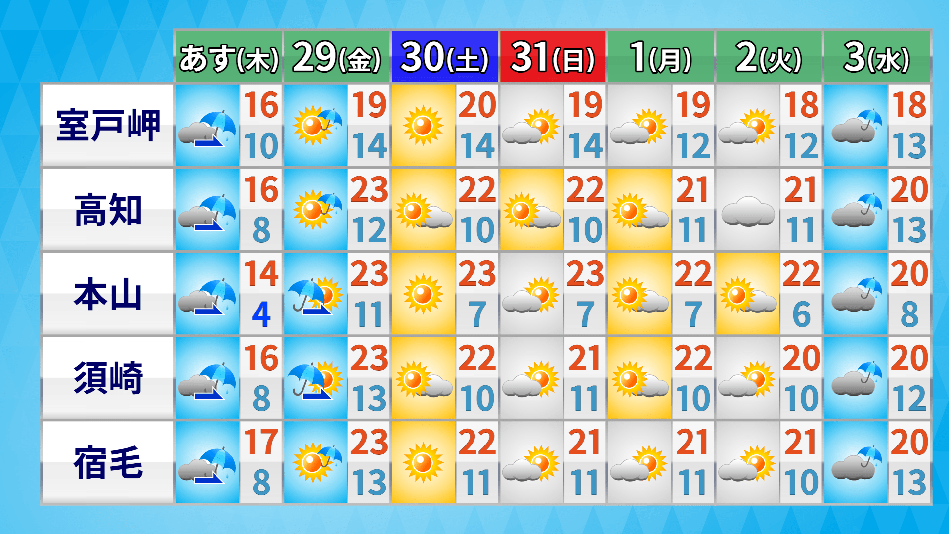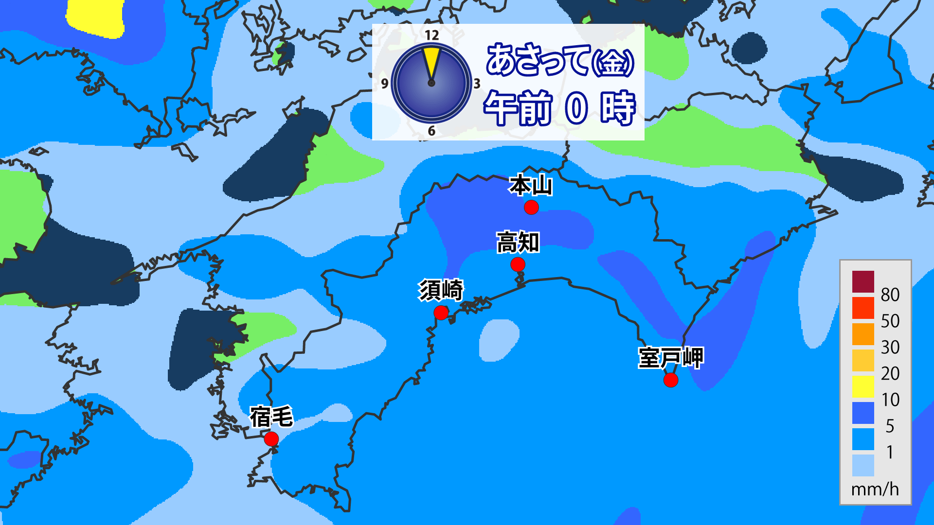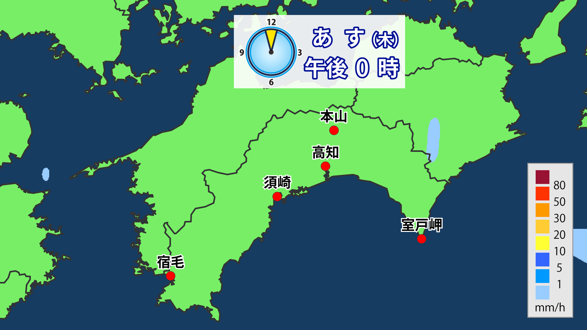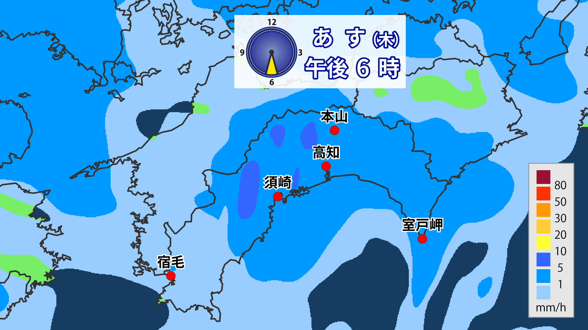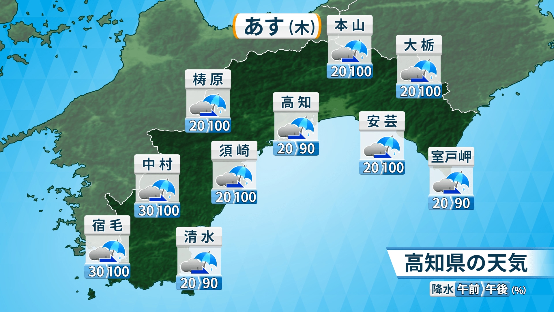 昼過ぎから雨雲がかかり始め、帰宅する時間帯には高知県内全域で雨となる見通しです。夜遅くには雨脚が強くなるでしょう。朝は雨が降っていなくても傘を忘れずに持って出かけてください。