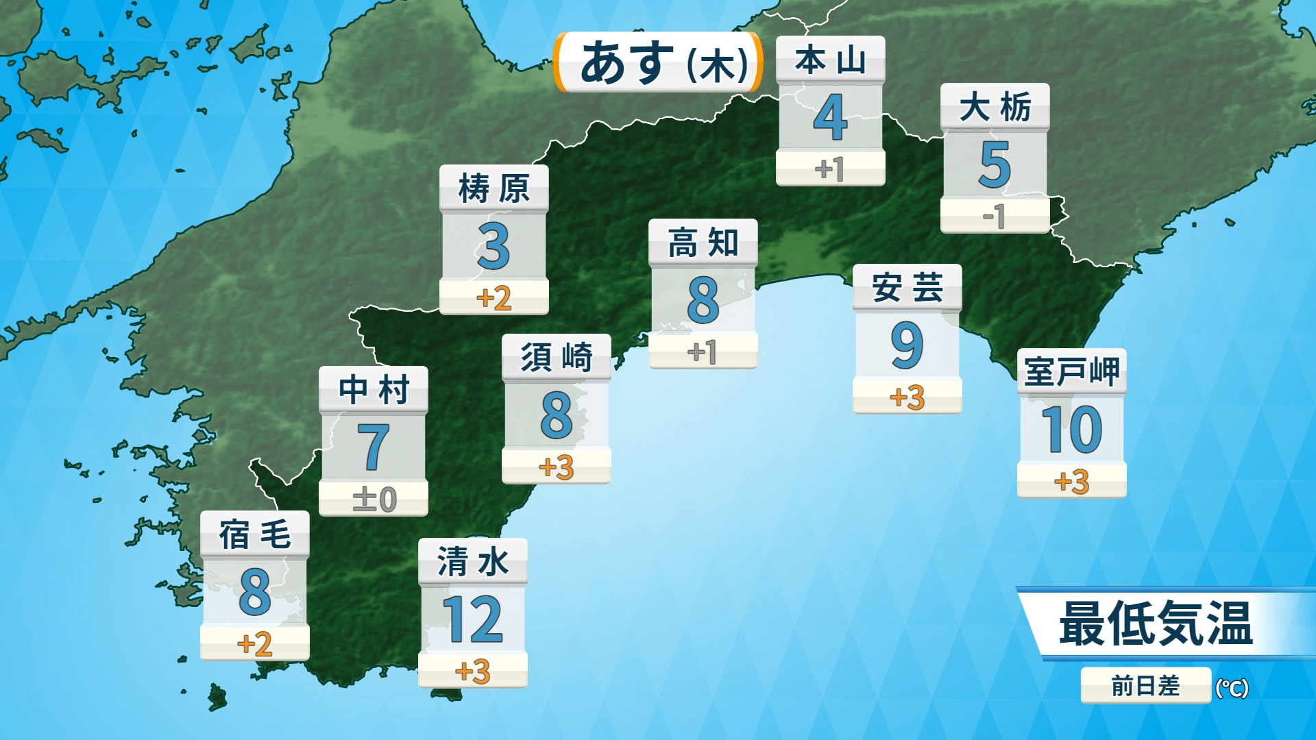 朝の最低気温は27日朝よりやや高くなり平野部で8度前後の予想です。山沿いでは4度ほどと、朝は引き続き冷え込みそうです。