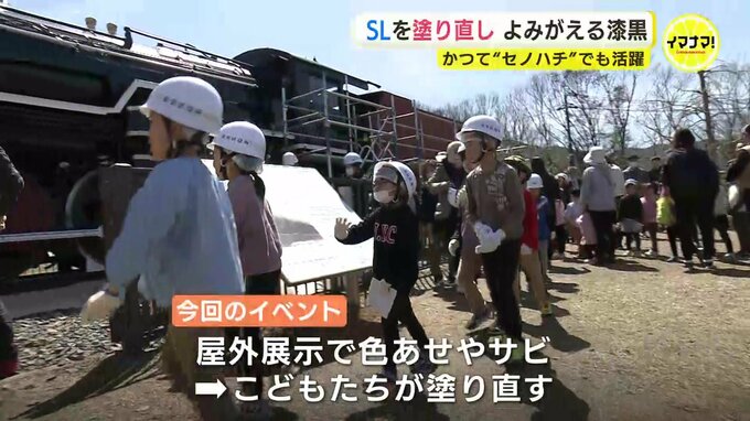 きょうは長年、屋外で展示され色あせやサビがあった蒸気機関車を塗り直すために、こどもたちが集まりました。子どもたちはローラーやハケを使って真剣な表情で塗っていき、現役当時のような「漆黒のボディ」がよみがえってきました。