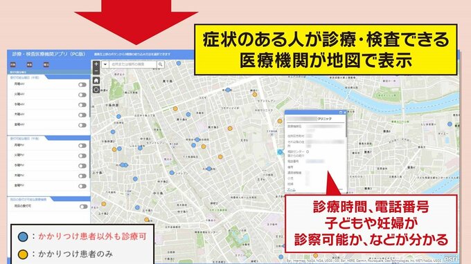 『発熱等、新型コロナウイルス感染症が疑われる症状がある場合の受診先です。』との記載があり、診察・検査が受けられる医療機関のマップが見られます。