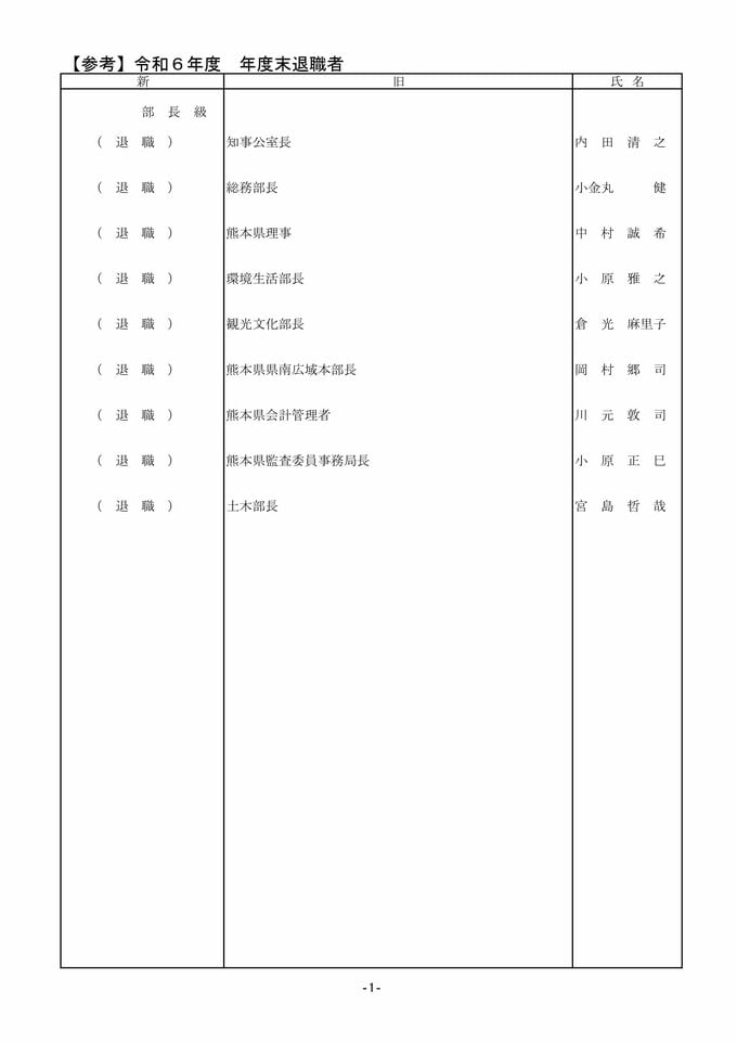 【全名簿一覧】熊本県職員人事異動情報2025〈各部署の部長~係長級〉〈議会事務局・企業局・病院局など〉 熊本放送 2025年3月26日(水) 16:31 国内 ▼令和6年度 年度末退職者 【部長級】 【次長級】 【課長級】
