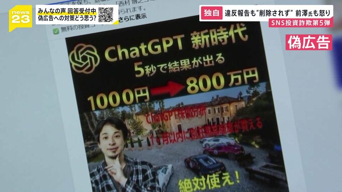 「『西村博之さんの投資ルール』という広告があります。“ChatGPT新時代”、“5秒で結果が出る”などと記載されています」