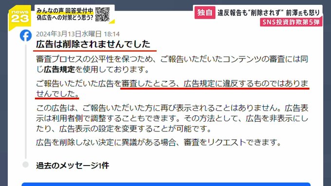 この広告について、news23では、明らかなニセ広告だとして、フェイスブック上で「詐欺または誤解を招くコンテンツ」と報告しました。