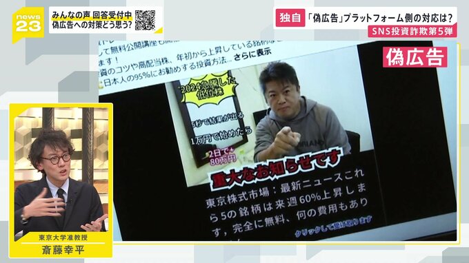 投資詐欺に限らず、“絶対に痩せる”といった広告もたくさん見かけますし、フェイク動画もどんどん精巧になってきていて、ゾクッとする怖さがある。AIによる生成動画も合わせて、ネット上ではびこる情報を、どう精査していくのかについて、新しい技術も使いながら、規制もしながら、進めていかないといけないのかなと思います。うまい話には裏がある、ということを、もう一度思い出さないといけないですね。