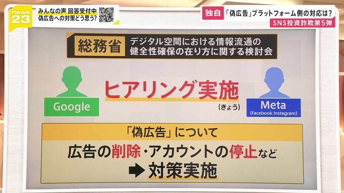 27日、総務省では、「デジタル空間における情報流通の健全性確保の在り方に関する検討会」が開かれ、GoogleやMetaの担当者にヒアリングを行いました。ニセ広告に関するヒアリングは、この日が初めてだということです。担当者らは、検討会の中で、広告の削除やアカウントの停止など、対策を行っていると説明したということです。