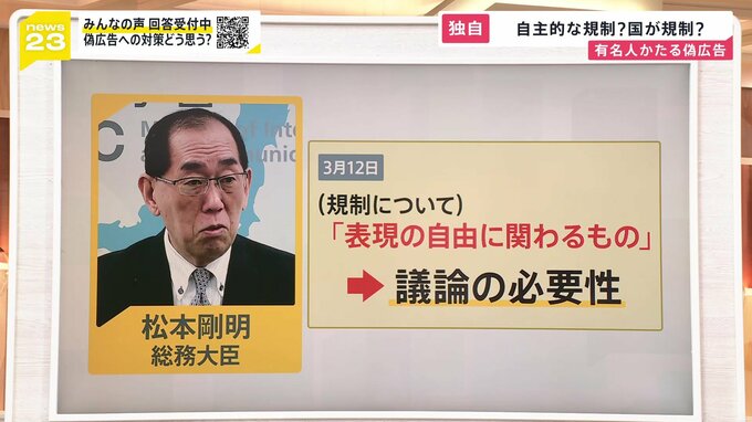 法規制を巡って、松本 総務大臣は、「表現の自由に関わるものとして、議論の必要性」を指摘しています。