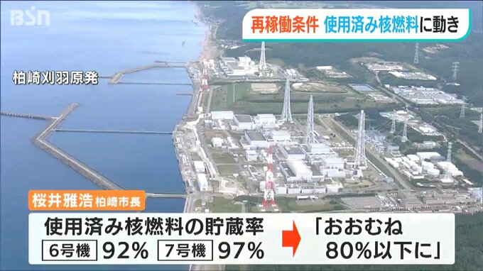 柏崎市の桜井雅浩 市長は再稼働を認める条件の一つとして、使用済み核燃料の貯蔵率がいずれも90%を超える6、7号機について、おおむね80%以下にすることを求めています。