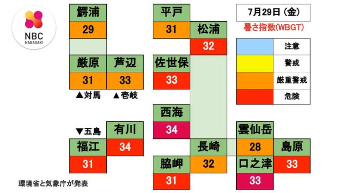【29日(金) 熱中症警戒アラート】長崎県は「熱中症の危険性が極めて高い気象状況」に 長崎放送 2022年7月28日(木) 16:41 国内 気象庁と環境省は熱中症の危険性が極めて高いとして、長崎県に熱中症警戒アラートを出し、外出をなるべく避け、室内をエアコンなどで涼しい環境にして過ごすよう呼びかけています。 ▼熱中症警戒アラート 29日(金)は、熱中症の危険性が極めて高い気象状況になることが予測されます。 ■予測される 日最高暑さ指数(WBGT) 鰐浦29、厳原31、芦辺33、平戸31、松浦32、佐世保33、西海34、有川34、長崎32、雲仙岳28、島原33、福江31、口之津33、脇岬31 【WBGTの目安】 31~:危険、28~30:厳重警戒、25~27:警戒、~24:注意