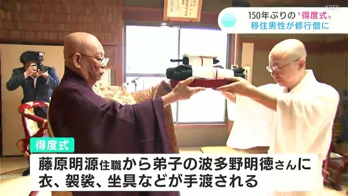 得度式が行われたのは高知市の宗安禅寺です。得度式は僧侶になるための正式な儀式で、28日、藤原明源(ふじわら・みょうげん)住職から弟子の波多野明徳(はたの・みょうとく)さんに衣、袈裟、坐具など僧侶として生きていくために必要なものが手渡されました。
