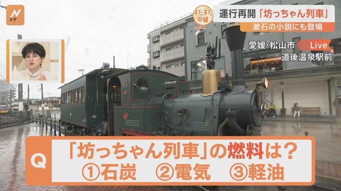 「歩いて発見!すたすた中継」。夏目漱石の小説にも登場する愛媛県松山市の「坊っちゃん列車」の話題をあいテレビの滝香織アナウンサーがお伝えします。