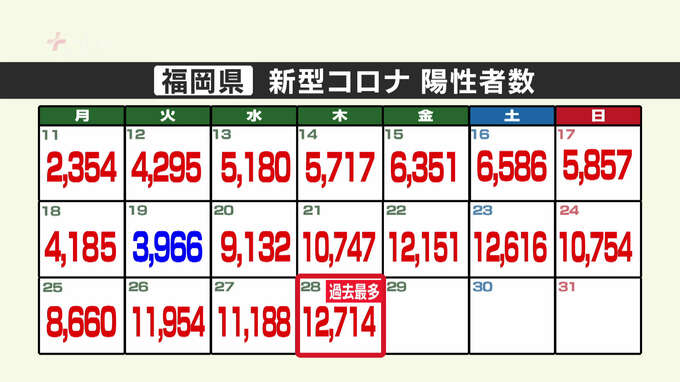 新型コロナウイルスについて福岡県は28日、新たに1万2714人の陽性を発表しました。過去最多を更新しています。発表自治体別の内訳は、福岡市が4961人、北九州市が2385人、久留米市が570人、…