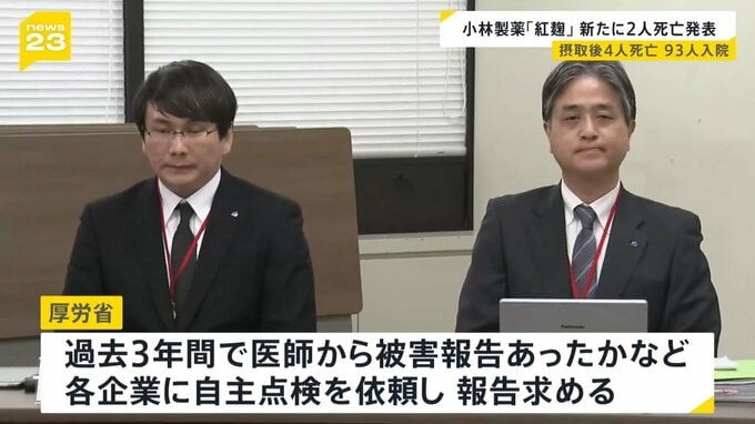 厚労省は、小林製薬の紅麹原料の供給を受けた企業を公表。過去3年間で医師から健康被害の報告があったかどうかなど、各企業に自主点検を依頼し、報告を求めるとしています。