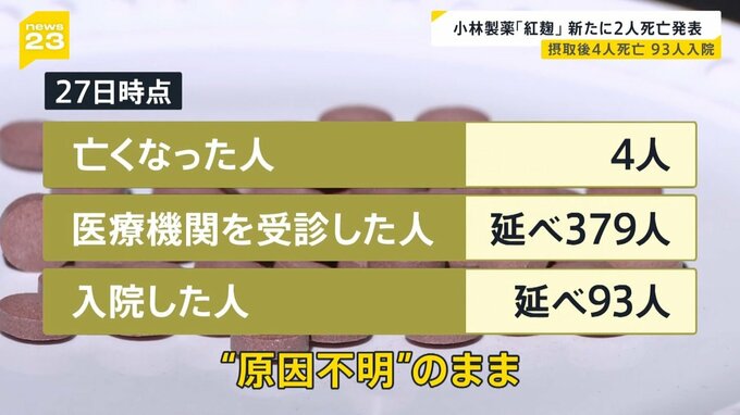 小林製薬は28日、「紅麹コレステヘルプ」を飲んでいた人が、さらに2人亡くなったと発表しました。1人は2021年ごろ、もう1人は2022年初旬ごろにサプリを摂取していたといいます。